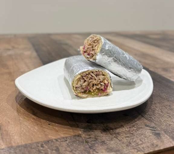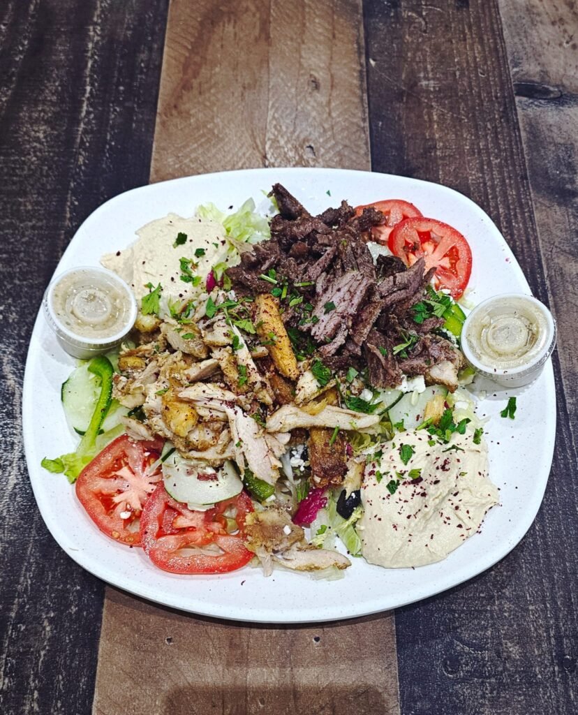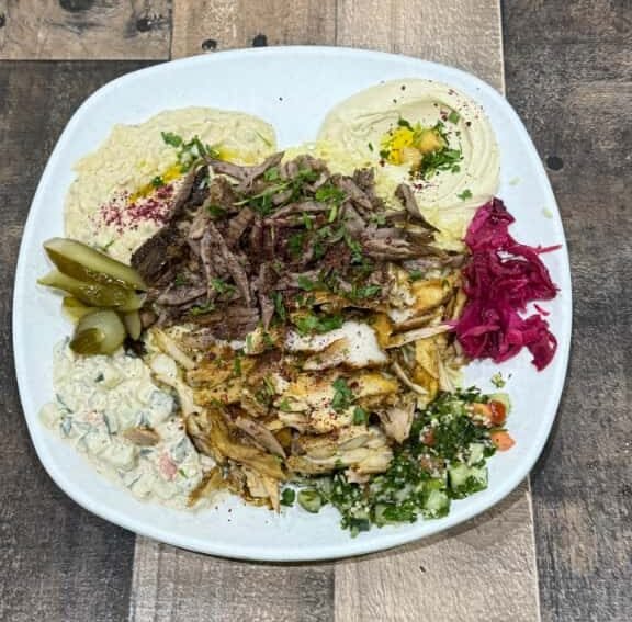 Grilled green peppers, onion, meat, seasoned chicken topped with lettuce, tomatoes, red cabbage, pickles, tahini sauce, and garlic sauce.