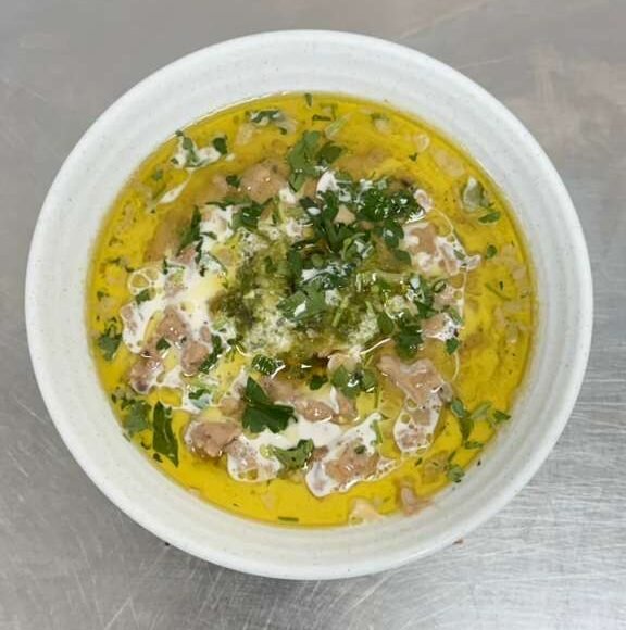 Slow-cooked fava beans mashed with fresh green pepper, garlic, lemon, and olive oil.